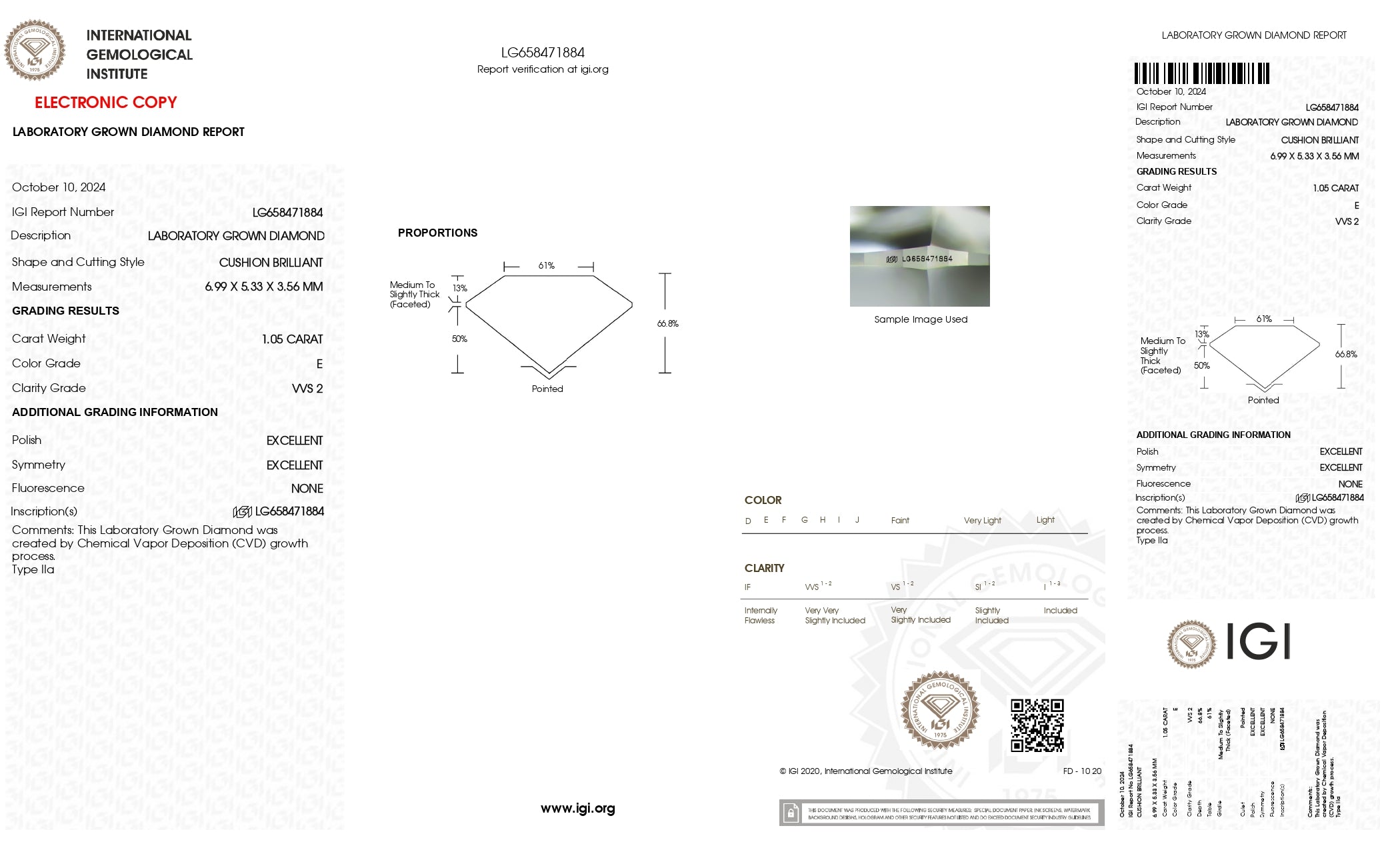 This listing is for IGI Certified 1.05Carats/6.99mm E/VVS2 In Stock Cushion Shaped Lab Grown Diamond Loose For Engagement Ring, Ready To Ship, TV2908.