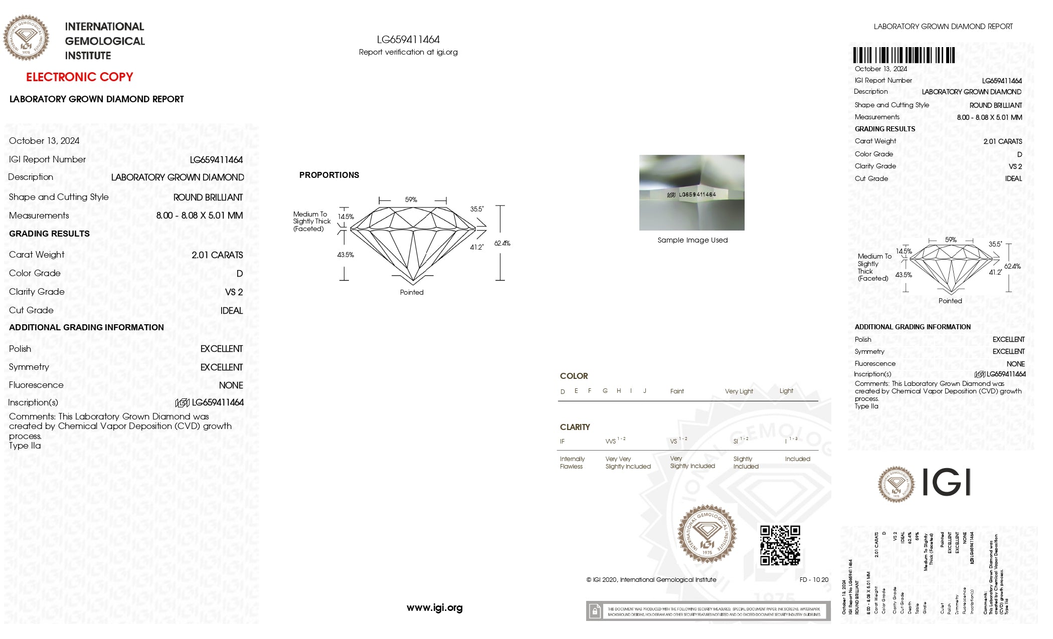 This listing is for In Stock IGI Certified 2.01CTW/8mm D/VS2 Round Brilliant Cut Shaped Lab Grown Diamond Loose For Engagement Ring, Ready To Ship, TV2942.