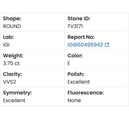 This listing is for In Stock IGI Certified 3.75CTW E/VVS2 Round Brilliant Cut Shaped Lab Grown Diamond Loose For Engagement Ring, Ready To Ship, TV3171.