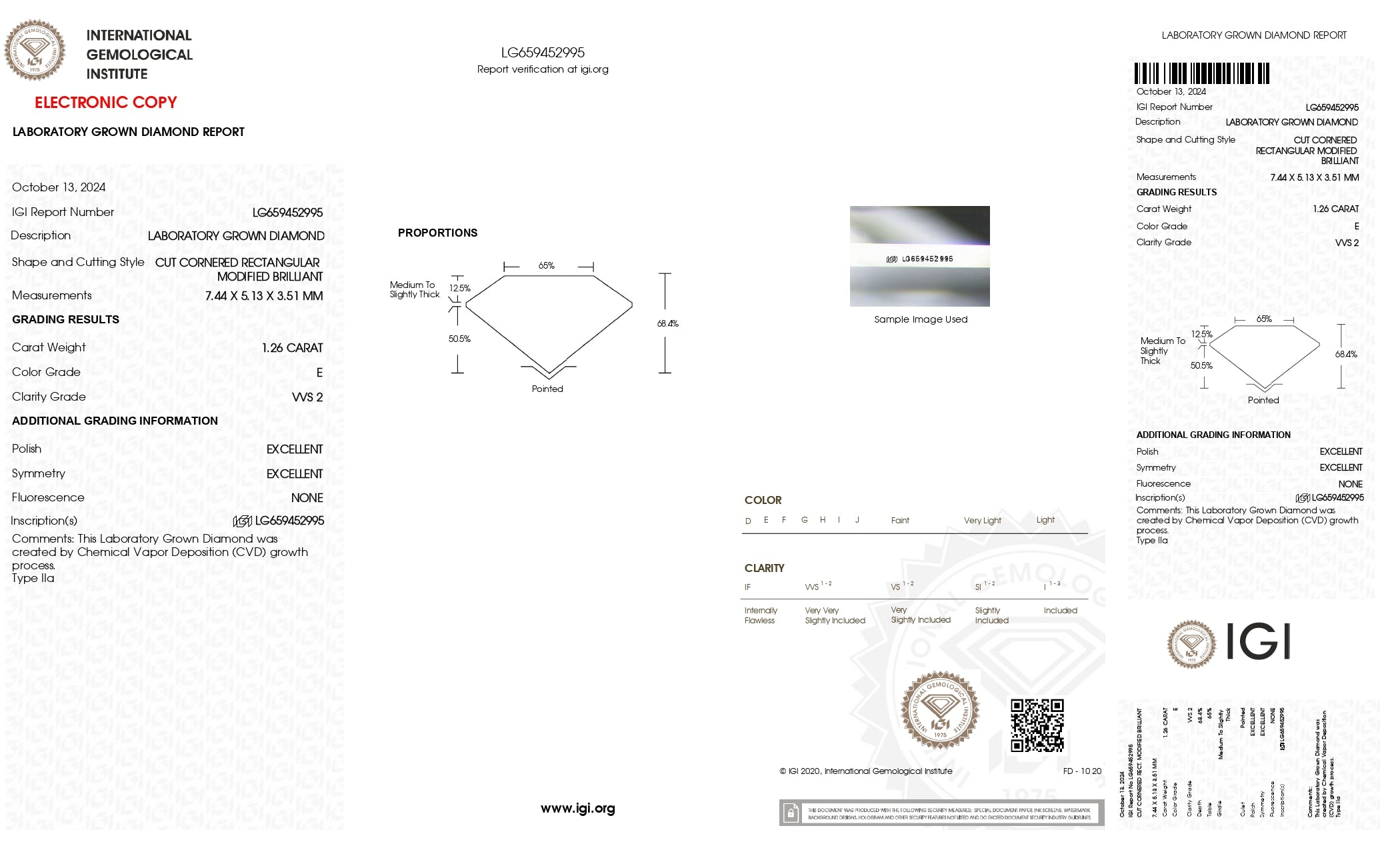 This Listings is In Stock 1.26CTW Radiant Cut Lab Grown Diamond, E/VVS2, IGI Certified, Loose Stone for Engagement Ring - Ready to Ship, VS1627.